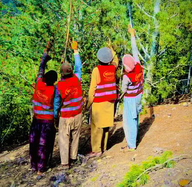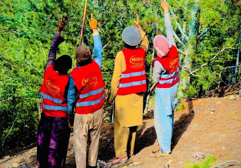 Majestic pine nut trees stretching across the rugged Waziristan landscape under a clear blue sky.